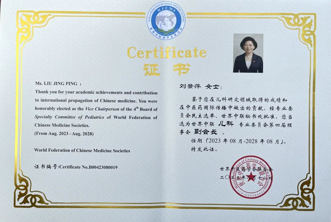 w66旗舰厅药业集团党委书记、董事长刘景萍当选世界中医药学会联合会儿科专业委员会第四届理事会副会长